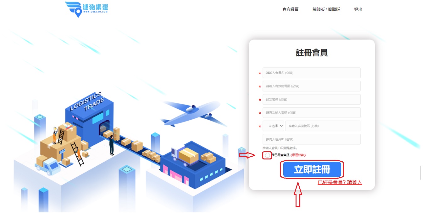 認真閱讀速淘集運《承運條款》條款後,勾選 我已同意速淘集運《承運條款》;最後,點擊【立即註冊】按鈕 即可註冊成功;